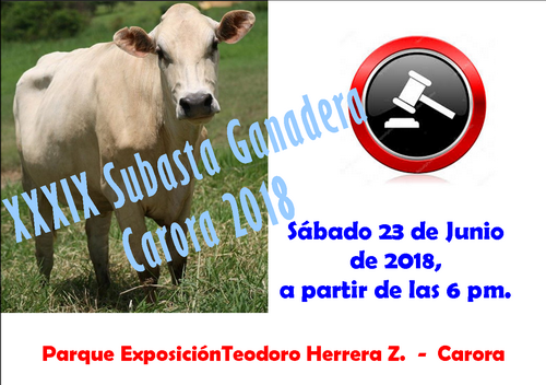 Carora: Mayo de 2018 Estimado amigo. Por medio de la presente y en nombre de la Asociación Venezolana de Criadores de Ganado Carora (ASOCRICA), reciba un cordial saludo y nuestro mayor deseo de éxitos. Los días Jueves 21, Viernes 22 y Sábado 23 de Junio de 2018, nos disponemos a realizar las XI Jornadas de Producción de Ganado Carora “Franco Mario Cerutti D.”, en homenaje al M.V. Eleazar López Fermín, en el Teatro Alirio Díaz de la ciudad de Carora, Estado Lara. Nos hemos esmerado en seleccionar las charlas siguiendo los tópicos que los asistentes nos han indicado en anteriores jornadas. Aspiramos que los temas propuestos sean del agrado todos Uds. (anexo programa de charlas). Además del refrigerio se incluye: material POP de la Empresas participantes, bolígrafo y material de apoyo. El Sábado 23 de junio de 2018, realizaremos un día de campo en Hacienda La Baragueña, ubicada a la margen de Río Tocuyo, sector Jerusalem, Carora. Edo. Lara. El día Sábado 23, además, tendremos también la GRAN SUBASTA 2018, a partir de las 6 p.m.